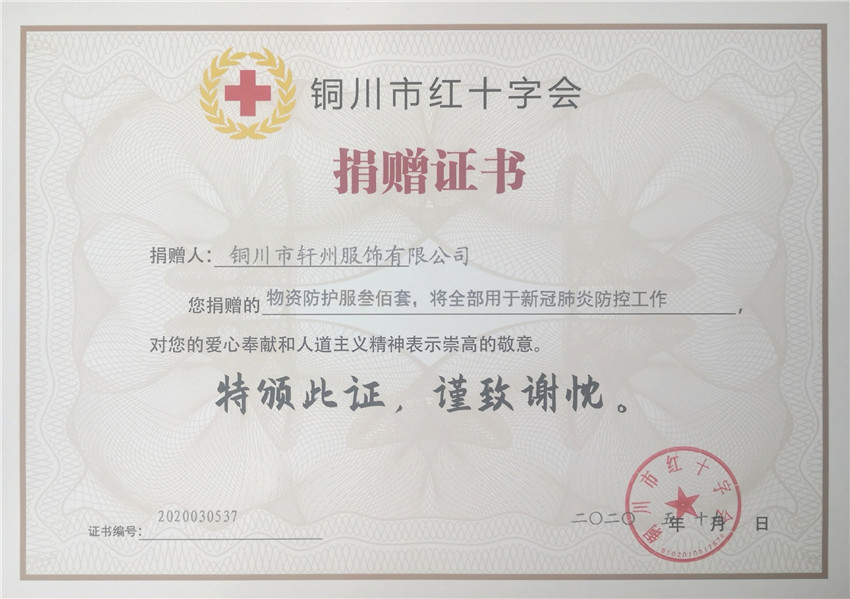 銅川市紅十字會(huì)捐贈(zèng)證書